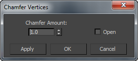 Chamfering creates new faces around the chamfered entity, along with connecting edges. Or, with the Open option, you can create an open (empty) area instead. For vertices, edges, and borders, you can set the chamfer amount numerically and toggle the Open option. The Segments setting applies only to edges and borders.
