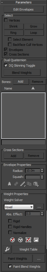 The Parameters rollout provides controls for adding bones to the modifier, adjusting envelopes, and setting vertex weights manually. Alternative methods for setting weights are also available here.
