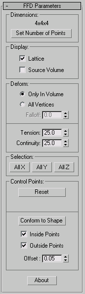Adjusts the unit dimensions of the source volume and specifies the number of control points in the lattice. Note that the point dimensions also show up beside the modifier name in the stack list.