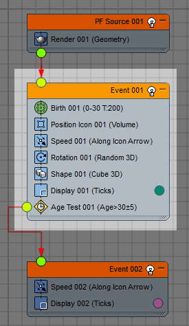 A birth event is a special type of local event that always comes at the start of a particle flow, immediately after the global event. Its first action is a Birth operator or Birth Script operator. The birth event can contain any number of additional actions, and can be succeeded by any number of additional events.
