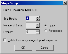 The Strips Setup dialog appears. The dialog displays the output resolution, and lets you determine how to split up the rendering job by specifying the number of horizontal strips into which the image will be subdivided.