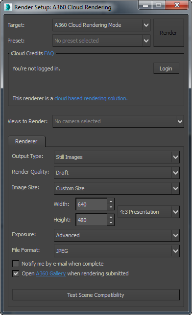 - Click to log in to the Autodesk Cloud. Once you are logged in, this panel shows your resources, estimated wait time, and links to the Autodesk Rendering interface.