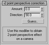 The Camera Correction modifier applies two-point perspective to a camera view. By default, camera views use three-point perspective, in which vertical lines appear to converge with height. In two-point perspective, vertical lines remain vertical.