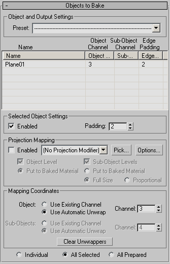 The radio buttons at the bottom of the rollout let you choose which objects to bake.