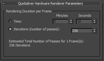 The main rollout for the Quicksilver hardware renderer lets you adjust render quality by setting either the time to spend on rendering, or the number of iterations to perform.