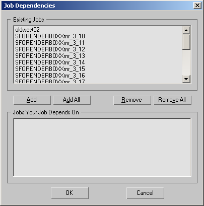This dialog lets you specify jobs that shouldn't begin rendering until other jobs finish. Use the two lists and the Add and Remove buttons to build a list of jobs that must finish rendering before the current job can start.