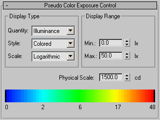 Pseudo Color Exposure Control is actually a lighting analysis tool that provides you with an intuitive way of visualizing and evaluating the lighting levels in your scenes. It maps luminance or illuminance values to pseudo colors that show the brightness of the values being converted. From darkest to brightest, the rendering shows blue, cyan, green, yellow, orange, and red. (Alternatively, you can choose a grayscale where the brightest values are white, and the darkest are black.) The rendering includes the colored or grayscale spectrum bar as a legend for the image.