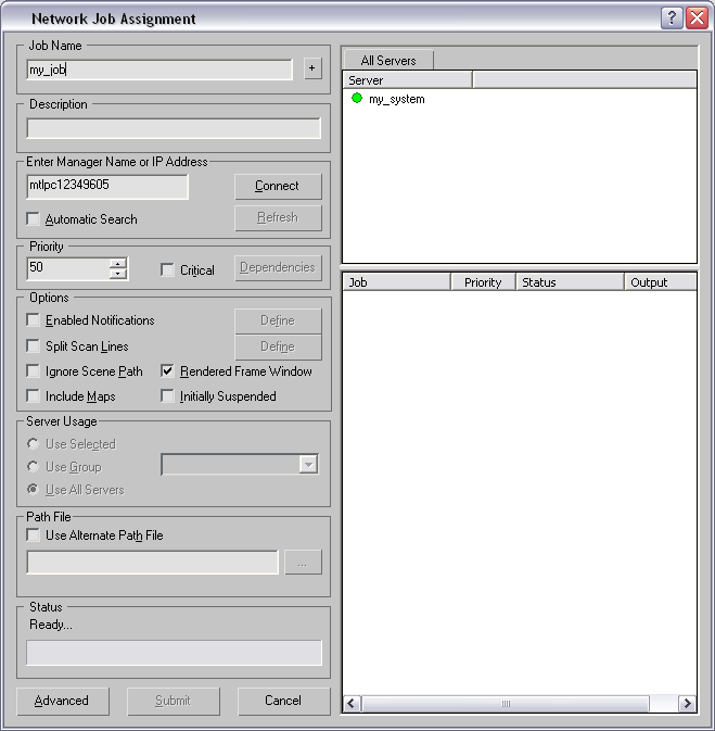 Use the Network Job Assignment dialog to name rendering jobs, specify the computers that will participate in the rendering, and submit jobs to the rendering servers.