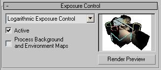 - The thumbnail displays a preview of the rendered scene with the active exposure control applied. Once a preview has been rendered, it updates interactively when you changed exposure control settings.