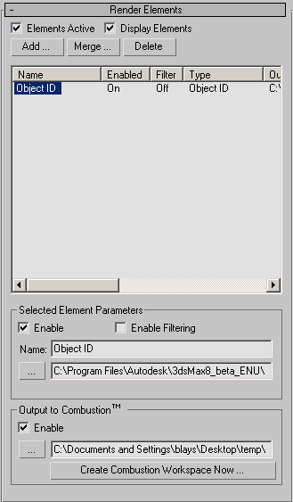- Click to merge the render elements from another 3ds Max scene. Merge displays a file dialog so you can select the scene file to get the elements from. The list of render elements in the selected file is added to the current list.