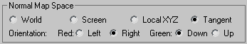 For example, if you use World mode with Red set to –X and Green set to –Y, areas that are red in your normal map indicate that the normals face toward –X, and green areas indicate that the normals face toward –Y.