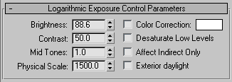 Logarithmic Exposure Control uses brightness, contrast, and whether the scene is outdoors in daylight to map physical values to RGB values. You can use it with either the default scanline renderer or the mental ray renderer. Logarithmic Exposure Control is best for scenes with a very high dynamic range.