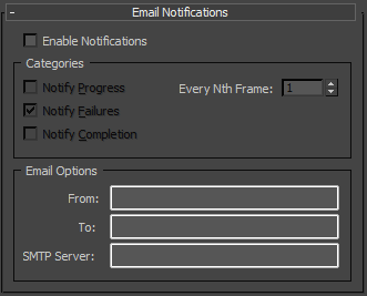 - Sends emails to indicate rendering progress. An email is sent every time the number of frames specified in Every Nth Frame has completed rendering. Default=off.