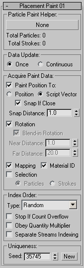 The Placement Paint operator uses a Particle Paint helper to acquire particle seeds from which to generate particles. Placement Paint sets particle positions, rotation, and mapping.