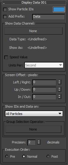 - Selected Particles Only Displays data only for selected particles. To select particles, use the Modify panel > Selection rollout controls and use standard viewport selection methods to pick particles to see their data (see the Particle Flow documentation for further information).