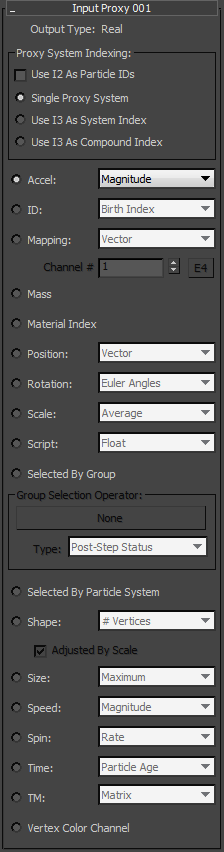 The remaining Input Proxy settings let you choose the property or properties to copy from the proxy particle system.