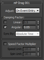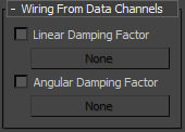 To access this rollout, highlight the mParticles Drag operator in the event, then right-click it and choose Use Script Wiring from the menu. This lets you define the Linear and Angular Damping Factor values per particle with a Data operator. The wiring defines damping factor values only; when Speed Factor Multiplier is on, the effect of the multiplier factor is applied on top of that.