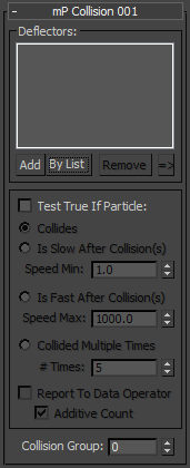 - Lists the non-particle objects that serve as deflectors in the MassFX simulation. This is the main difference between the mParticles Collision test and the standard Collision: Instead of using Deflector-type space warps, you specify geometry objects to which the PFlow Collision Shape (WSM) modifier has been applied. The Deflectors list can contain only such objects. If a geometry object is not modified with PFlow Collision Shape, it cannot be considered as a deflector for the mParticles Collision test.