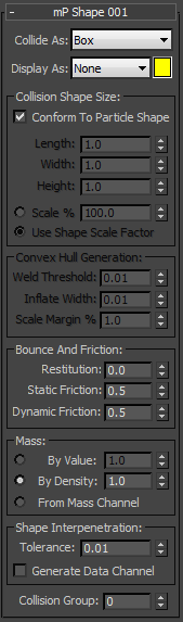 Note: Like the particle shape, the collision shape specified here persists throughout the particle flow, even when particles move to other events. Also, the collision shape, once defined, cannot be altered by a different mParticles Shape operator in a successive event.