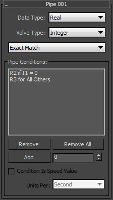 The list box in the Pipe Conditions group displays the conditions used to determine which data input gets piped through. For all valve types except Boolean, these are ranges based on values you specify. By default, if the valve type is not Boolean, a single condition (and input) exists, and is set to All, meaning that the input data is simply piped through. By adding conditions with the Add button, more