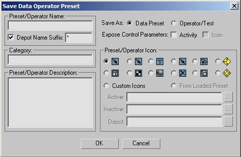 Use this dialog to save your Data operator or test as a preset or operator; in the latter case, it appears in the Particle View depot after you quit and restart 3ds Max.