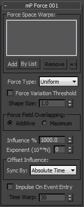 - To select a space warp assigned in mParticles Force, highlight it in the list and then click this button. This selects the space warp in the scene and makes it easy to access the space warp parameters.