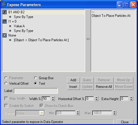 - The distance of the parameter from the right side of the rollout. In some cases you'll need to adjust the Width % and Horizontal Offset % values after exposing the parameter.