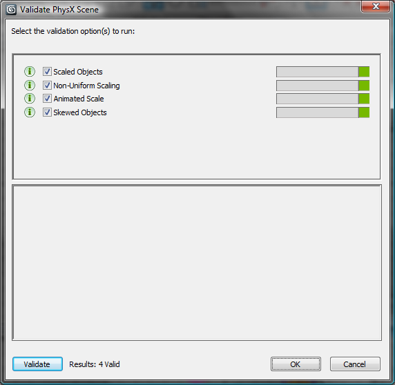 Use the dialog to perform validation tests to ensure that the MassFX scene exports properly without errors. The validation options are as follows: