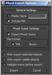 Important: PhysX Export saves the scene in a format readable by applications that use the PhysX SDK. This topic briefly covers the Export feature as implemented in 3ds Max. For detailed information about this exporter and applicable options, please refer to documentation included with the PhysX SDK.
