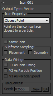 When you add a Data Icon operator or Data Icon Test to the particle system, Particle Flow creates an icon and places it at the world origin. You can control the icon's physical properties in Particle View via the rollout for the operator/test. You can perform calculations within the operator/test based on a specific property of the icon with the Icon suboperator. For example, you can use the Icon suboperator to measure the distance between a particle and the icon, or simply determine the speed or angular velocity of the icon.