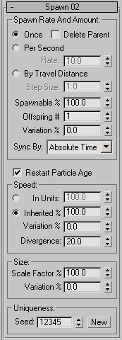 Lets you specify the speed of spawned particles in absolute terms or relative to the parents' speed, with optional random variation. The direction of a spawned particle is always in relation to that of its parent, but you can set a Divergence so they eventually spread out.
