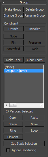 The Group rollout is for selecting groups of vertices and constraining them to surfaces and collision objects.