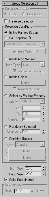 The Group Selection operator extends Particle Flow's ability to select particles. Originally in Particle Flow, you select a single group of particles explicitly that remains selected throughout the entire flow. With Group Selection, however, you can specify any number of groups according to various criteria: location, particle properties, at random, and more.