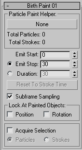 - Adjusts the Emit Start, Emit Stop, and Duration values to the timing of the Particle Paint helper's strokes. The Emit Start value is set to the earliest start time of the strokes, and the Emit Stop time is set to the latest stop time of the strokes.