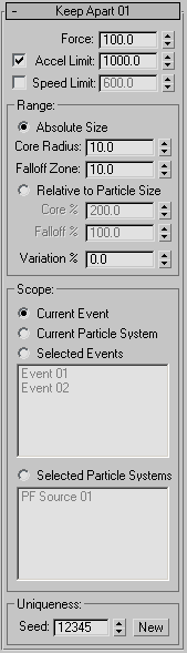 By default, the Keep Apart force keeps particles only in the current event (that is, the event that contains the Keep Apart operator) apart from each other when used locally, or particles in each event in the current flow apart when used globally. These settings let you alternatively keep particles away from particles in other events or flows without affecting the behavior of latter. Default=Current Event.