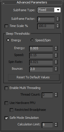 Tip: If you encounter instability in your simulation, such as objects moving when they shouldn't, try increasing the Subframe Factor value. The general rule of thumb for setting Subframe Factor is to double the