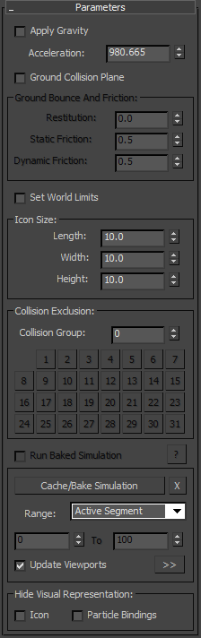 - Set the dimensions of the helper icon in world units. Usually, the size of the icon does not affect the simulation; it just shows the gravity direction and ground collision plane. The only exception is when Set World Limits (see preceding) is on.