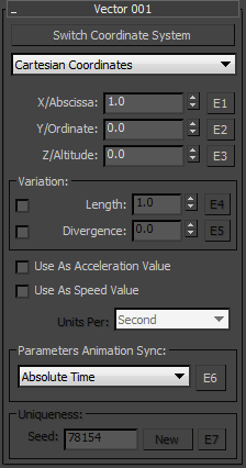 - These are available only with Cartesian Coordinates, Cylindrical Polar Coordinates, and Spherical Polar Coordinates; that is, option types that create a vector in 3D space. The Length value specifies the maximum variation in length for the vector value generated. The Divergence value specifies the maximum variation in direction (deviation) of the vector value generated, in degrees.
