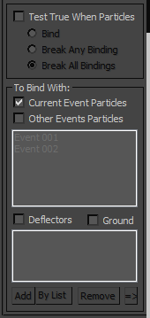 - Break Any Binding Occurs when a particle breaks any of its bindings; as with the Bind condition (see preceding), a particle keeps other bindings intact when redirected to the next event.