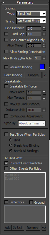 The settings in this group let you specify which other simulation entities a particle can bind with. It can be particles in the current event, particles in other events, deflectors, the ground, or any combination thereof.