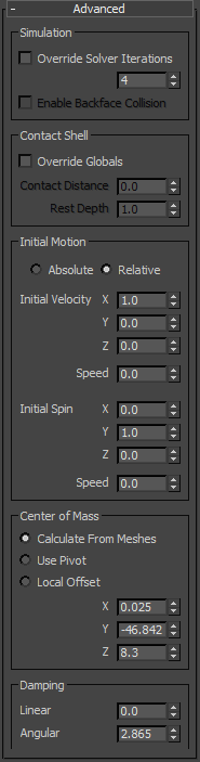 This setting applies only to rigid bodies that start out Kinematic (typically these are already animated) and then switch to Dynamic at the frame specified by the Until Frame controls on the Rigid Body Properties rollout. Normally, the initial velocity and initial spin of such bodies are calculated based on the animation for the last frame before they become dynamic. When this option is set to Absolute, the values of Initial Velocity and Initial Spin (see following) are substituted for the animation-based values. When set to Relative, the specified values are added to the values calculated from the animation.