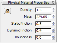 This rollout provides basic tools for using physical materials, which determine the way rigid bodies interact with other elements in the simulation. To set specific values, use the Physical Material Properties rollout (see following).