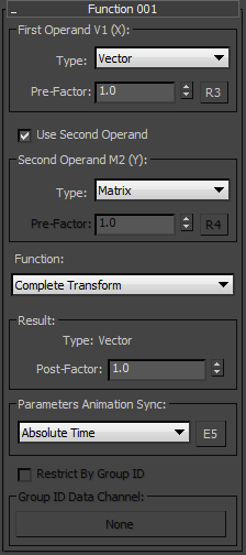 - When on, adds the R4 input to the suboperator, to which you can connect any suboperator that outputs a real value. This input pre-factor replaces the explicit Pre-Factor value, and is multiplied by the second operand before the function is applied.