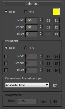 Each component has complementary buttons in the form E# or I#. The E# button creates an Equal-type parameter input that you can wire with a Parameter suboperator. This way you can wire the same value to different suboperators (a single parameter suboperator is wired to several suboperators with E-type input). The I# button defines an integer data input, which lets you wire individual color component values to every particle. Only one type—I# or E#—can be active at a time. When active, it creates an input of the corresponding type.