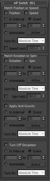 You can also exclude the global gravity forces for the particles in the event, and adjust position/speed/rotation/spin by using standard (non-mParticles) Particle Flow operators. With the Match options you can adjust particle properties in the simulation. The adjustments have some limits because, for example, you cannot match particle position if particles collide with each other (overlapping restrictions).