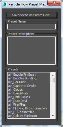 - Saves the current scene as a preset. The preset is saved as a pair of files: preset_name.txt with the description of the preset; and preset_name.max file with the scene itself. Both files are saved in /plugcfg/particle flow presets/ within the install folder. Since presets are saved as files, it is possible to exchange or modify the presets by manipulating the files.
