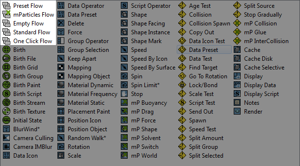 The Flows category provides shortcuts for creating different kinds of initial particle-system setups. To use a flow, simply drag it from the depot to the Particle View main window. The available flows are listed at the end of this topic.
