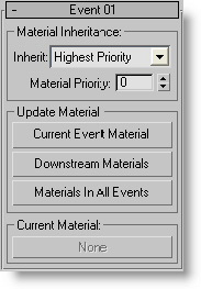 This section describes the material-inheritance controls that you access by clicking an event title bar as well as an additional new parameter, Sub-Mtl ID Offset, that has been added to operators that use materials.