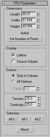 These options let you adjust the unit dimensions of the source volume, and specify the number of control points in the lattice. Note that the point dimensions are displayed beside the modifier name in the Stack list.