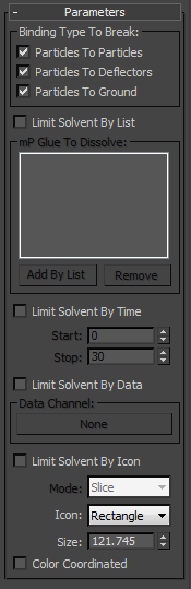 - Choose the types of bindings to remove. mParticles Glue can generate different types of bindings, as defined in the To Bind With group. You can toggle removal of bindings between particles (Particles To Particles), between particles and deflectors (Particles To Deflectors), and between particles and the ground (Particles To Ground).